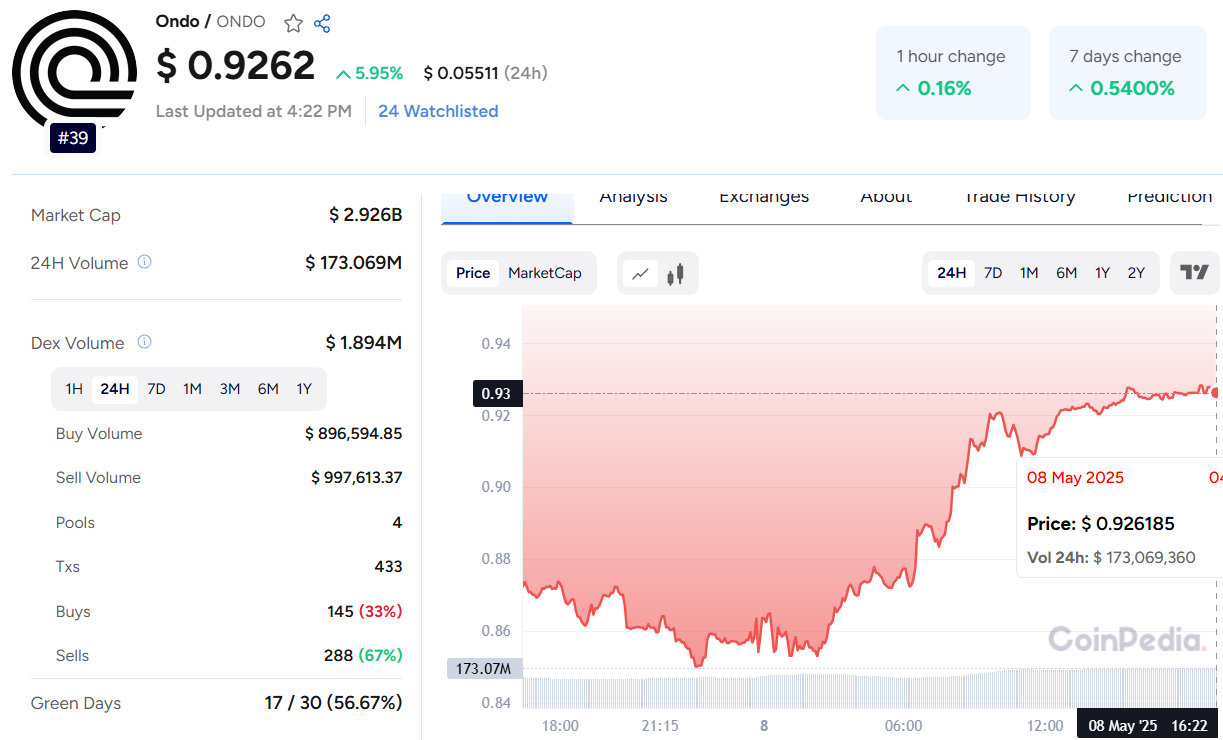 With Ondo crypto price trading around $0.9262, it’s up over 5.95% in just the last 24 hours.
