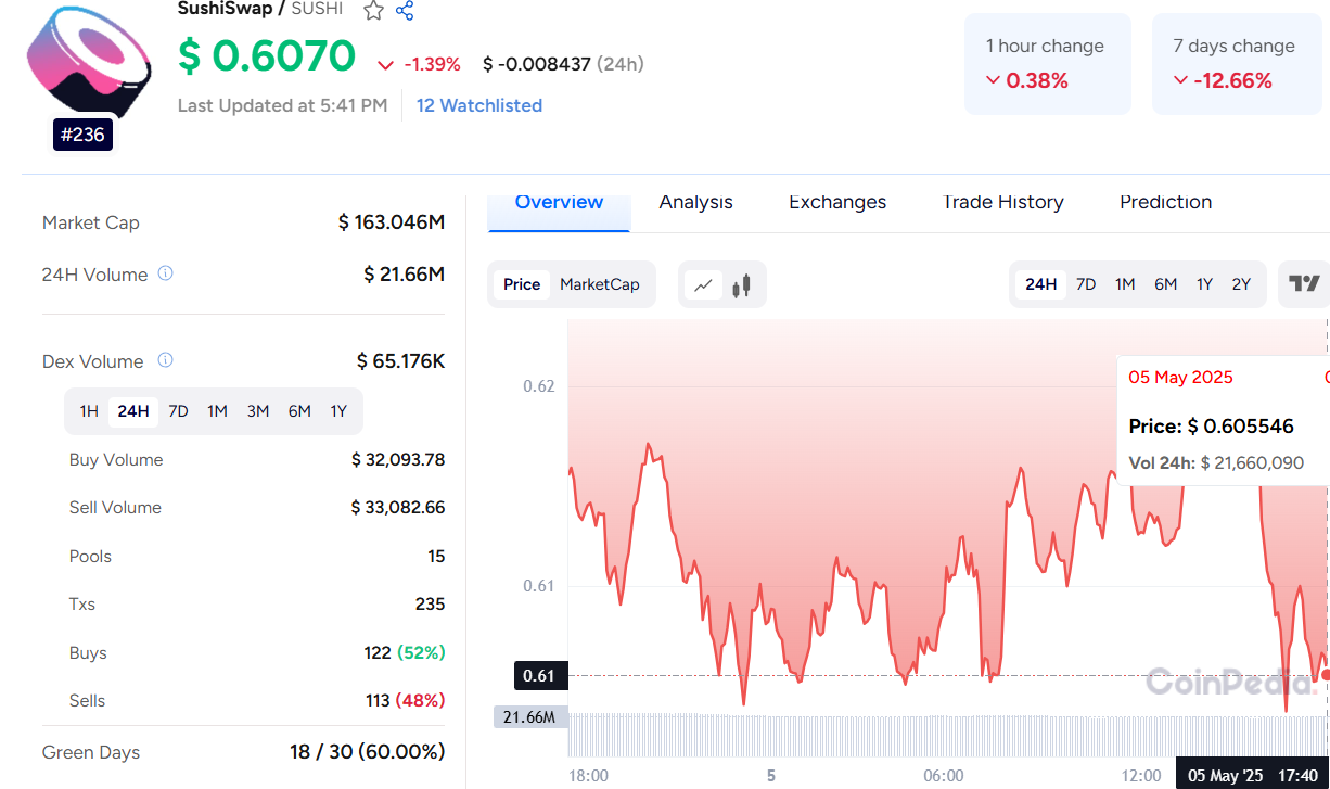 The live SushiSwap price today is $0.607, showing a slight dip of 1.39% over the past 24 hours, with a 24h trading volume of $ 21.66 M.