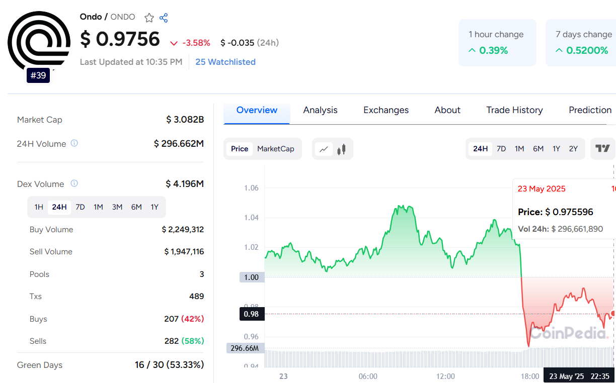 The live Ondo price today is $0.9756, with a 24-hour volume of $296.662 million, and it’s down 3.082% in the last 24 hours.