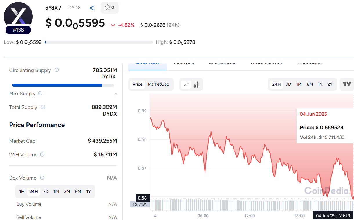 The dYdX crypto continues to face strong bearish pressure as it trades at $0.559, down over 4.82% from its March peak of $1.48.