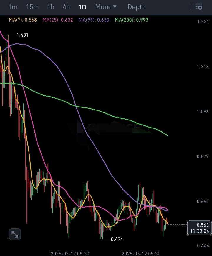 Local support lies at $0.49, and if this breaks, a deeper drop could be expected. Momentum is weak, and each bounce has been met with heavy selling, typical of a distribution phase.