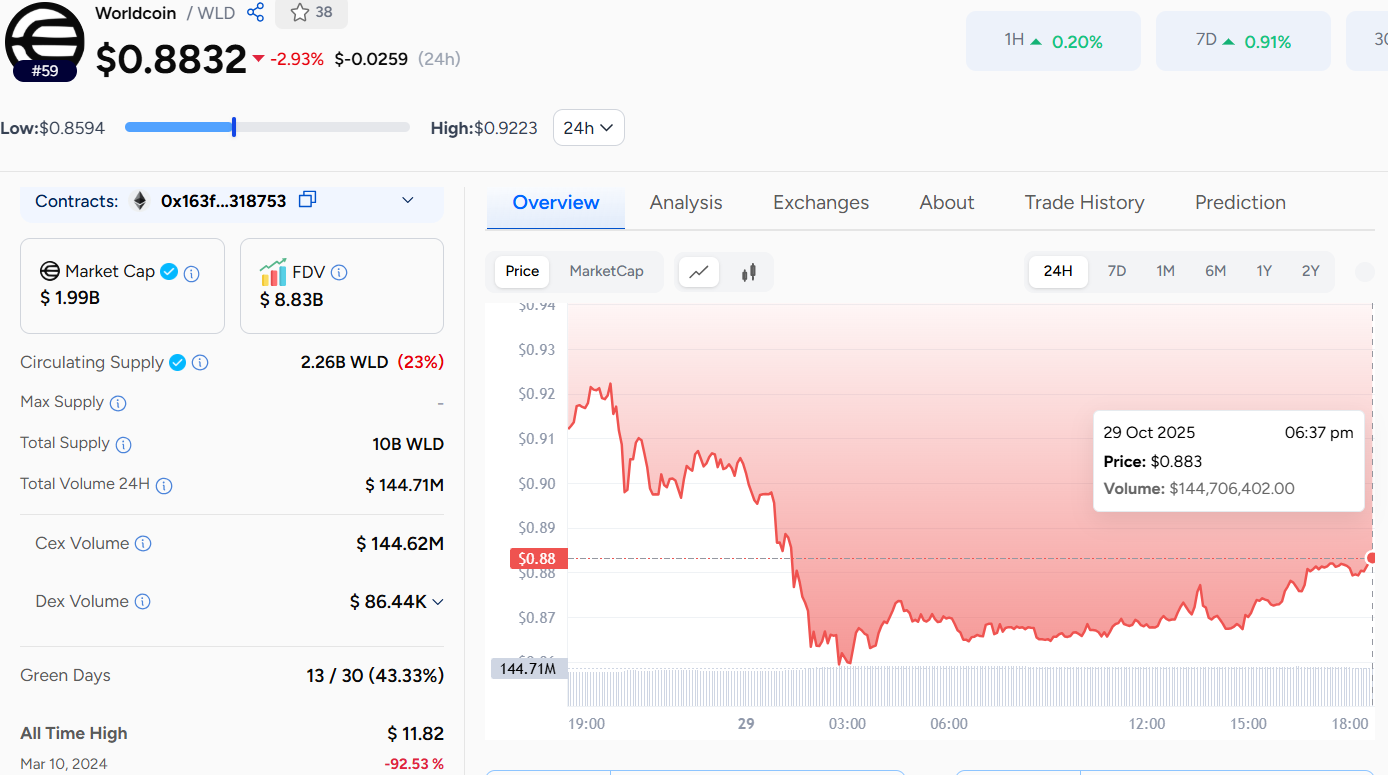 The Worldcoin price today is $0.8832, with a 24-hour trading volume of $144.71 million, reflecting a slight 2.93% decline.